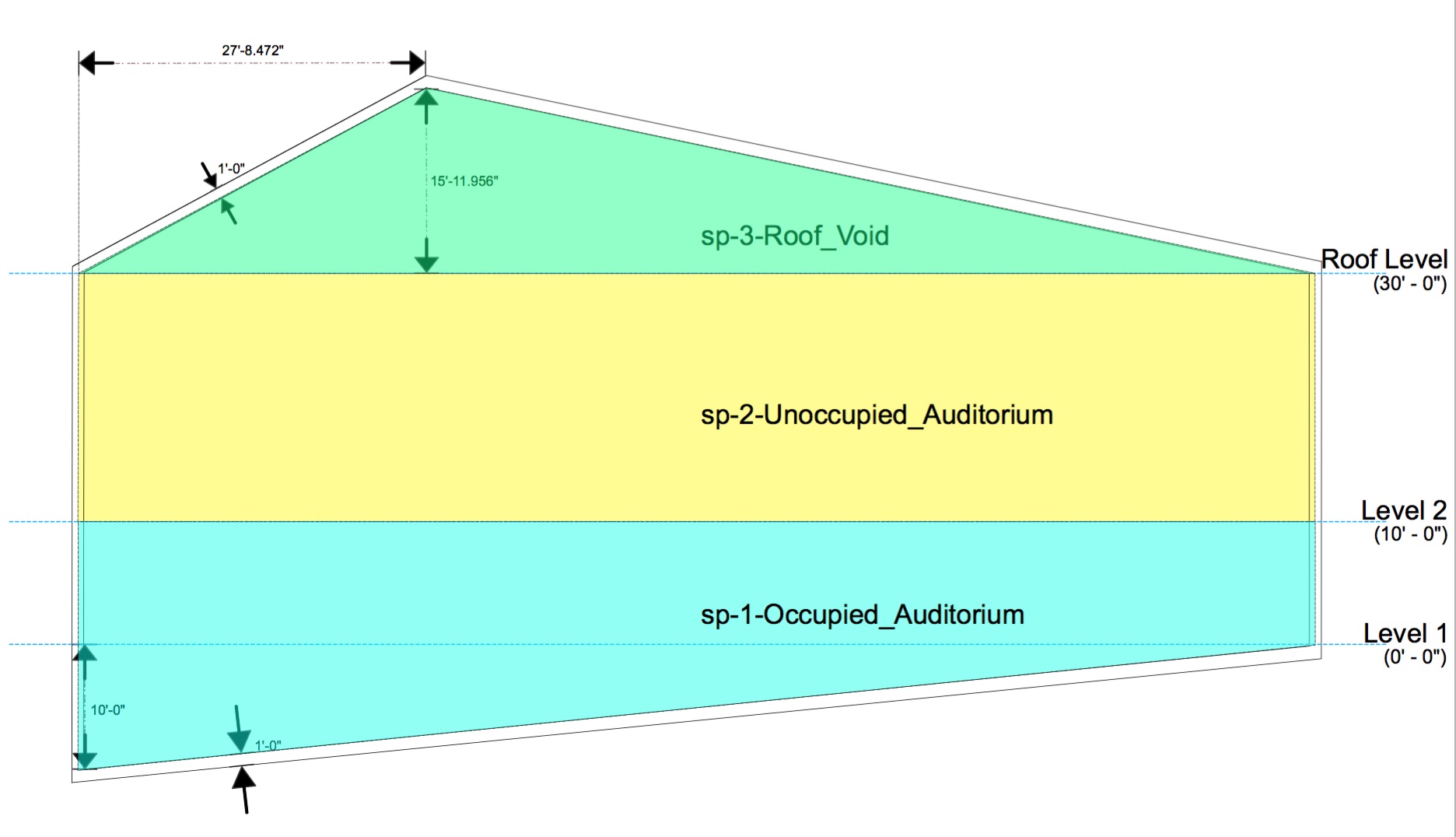 The test geometry consists of a single volume broken into three separate zones (shown in Figure 3), as might be typical of a large single volume space such as an auditorium where the space has been split up for load calculation purposes. Note that Openings of surfaceType Air have been added between sp-1-Occupied_Auditorium and sp-2-Unoccupied_Auditorium and sp-2-Unoccupied_Auditorium and sp-3-Roof_Void, respectively. It is expected that the user has defined something indicating that the volume is open, but that a zone boundary should exist. There are several mechanisms available to do this in CAD or BIM tools. When translated to gbXML, it is expected that the interface of these space boundaries consist of surfaces of type ceiling/interior floor (same thing in gbXML) with an Opening of type Air. It is very important that the space names in your certification file must adhere to the naming convention shown in Figures 1, 2, and 3. If the spaces are not named appropriately, then the validator software will not be able to achieve a Passing Score.