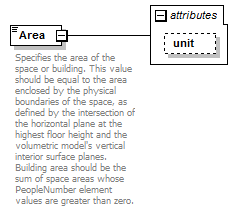 | source | <xsd:element name="Area"> <xsd:annotation> <xsd:documentation>Specifies the area of the space or building. This value should be equal to the area enclosed by the physical boundaries of the space, as defined by the intersection of the horizontal plane at the highest floor height and the volumetric model's vertical interior surface planes. Building area should be the sum of space areas whose PeopleNumber element values are greater than zero.</xsd:documentation> </xsd:annotation> <xsd:complexType> <xsd:simpleContent> <xsd:extension base="xsd:decimal"> <xsd:attribute name="unit" type="areaUnitEnum"/> </xsd:extension> </xsd:simpleContent> </xsd:complexType> </xsd:element> |